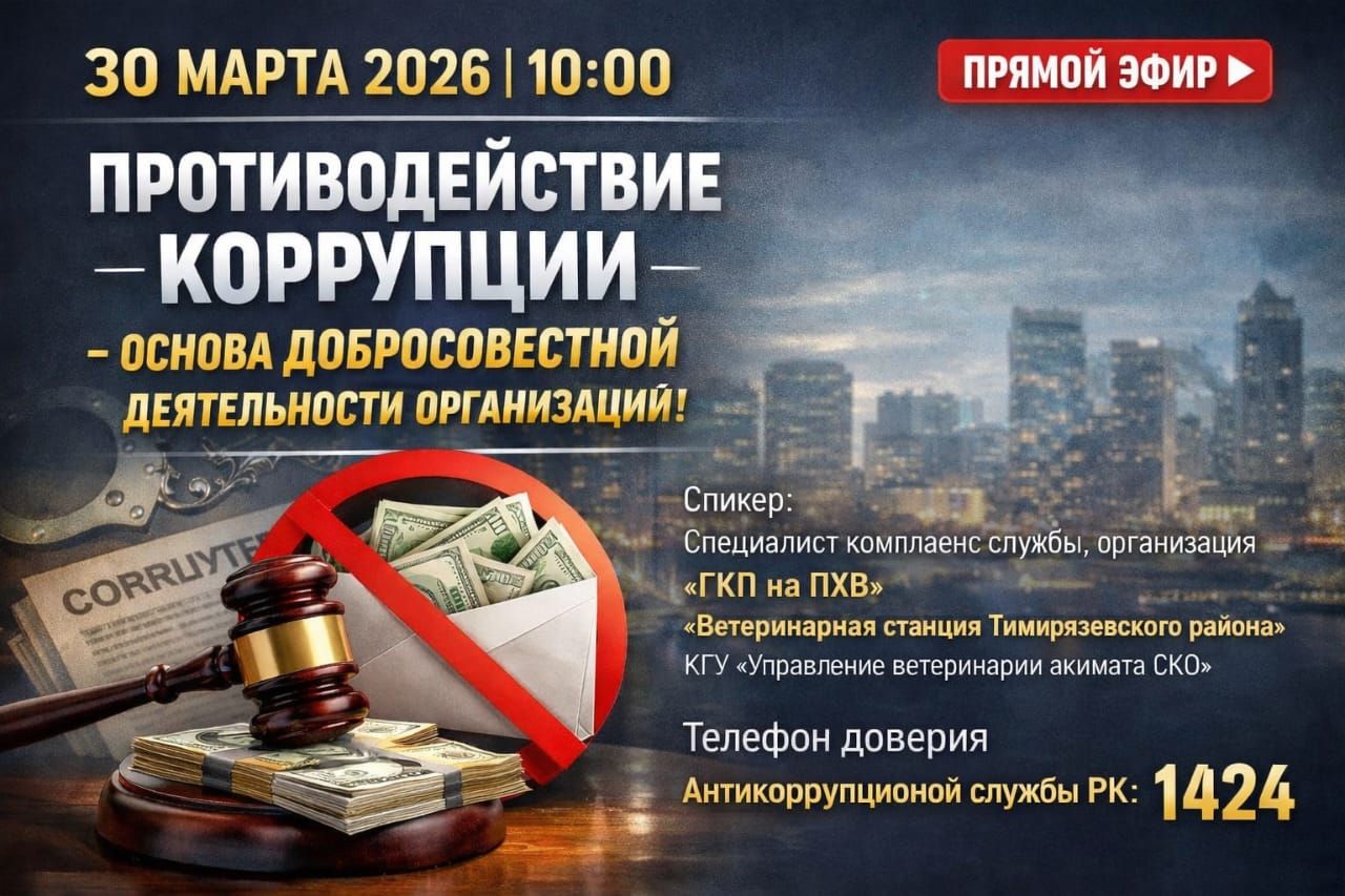 30.03.2026 жылы сағат 10:00-де" СҚО әкімдігінің ветеринария басқармасы "КММ" Тимирязев ауданының ветеринариялық станциясы "ШЖҚ МКК"сыбайлас жемқорлыққа қарсы іс-қимыл" ұйымының адал қызметінің негізі " тақырыбында тікелей эфир өтеді