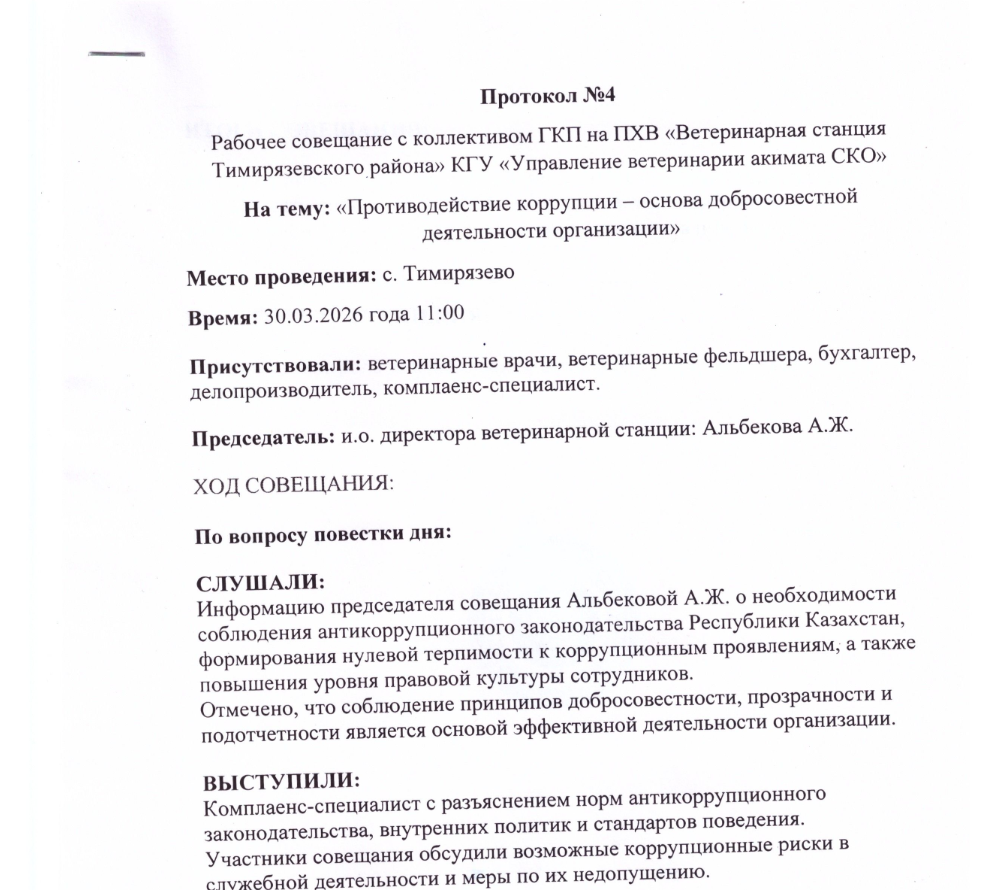 Қатысқандар: ветеринариялық дәрігерлер, ветеринариялық фельдшерлер, бухгалтер, іс жүргізуші, комплаенс-маман.
