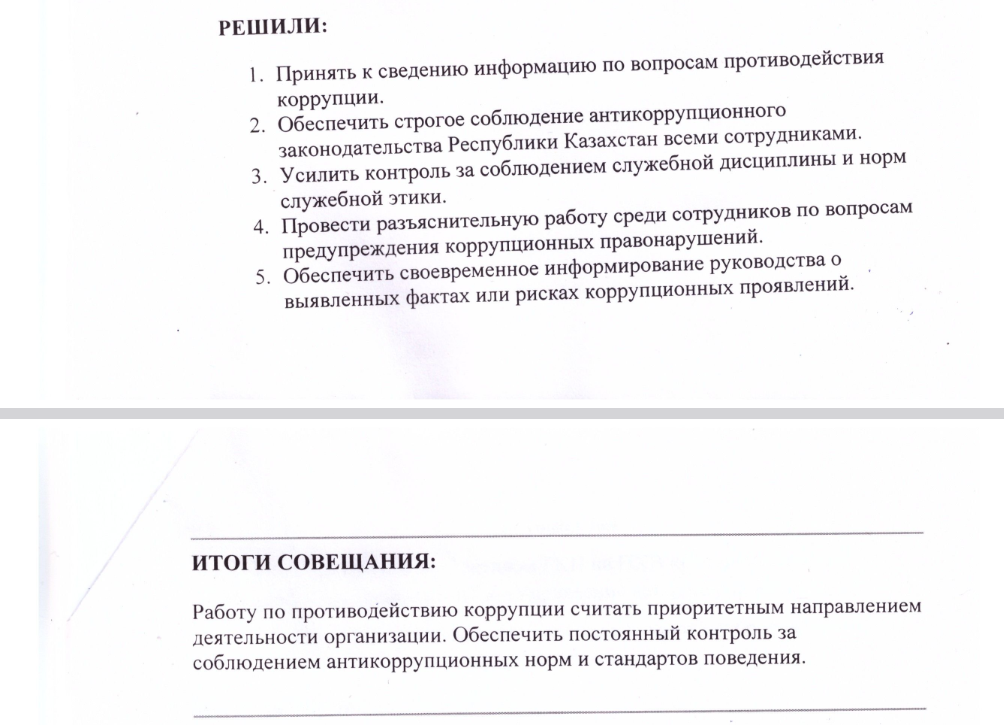 Сыбайлас жемқорлыққа қарсы іс-қимыл жөніндегі жұмыс ұйым қызметінің басым бағыты болып саналсын. Сыбайлас жемқорлыққа қарсы нормалар мен мінез-құлық стандарттарының сақталуына тұрақты бақылауды қамтамасыз ету.