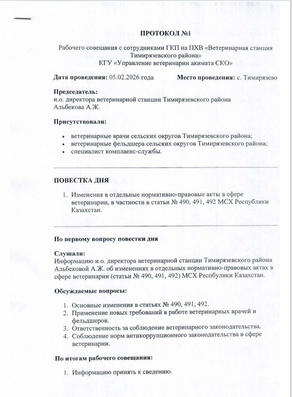 Повестка дня: Изменение в отдельные нормативно-правовые акты в сфере ветеринарии, в частности в статьи 490,491,492 МСХ Республики Казахстан. Й