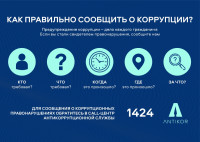 Обо всех фактах коррупции, о которых вам стало известно, необходимо сообщить по телефону доверия государственного учреждения 8-71531-20096, либо на номер 1424 (звонок бесплатный).