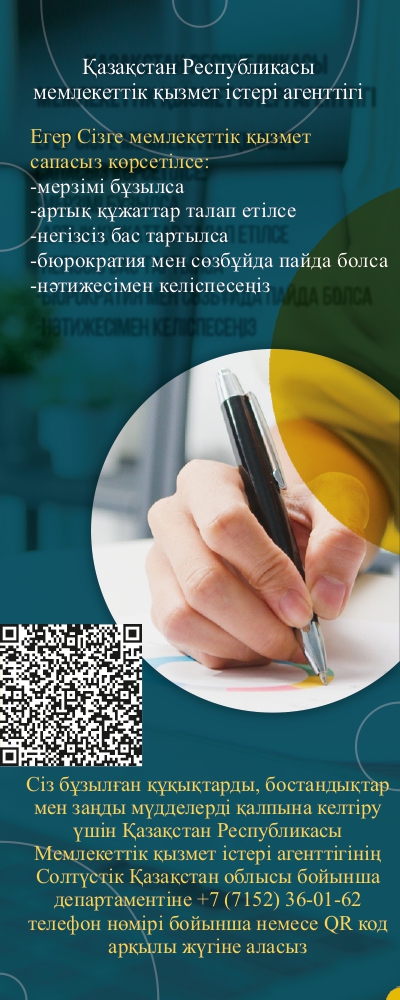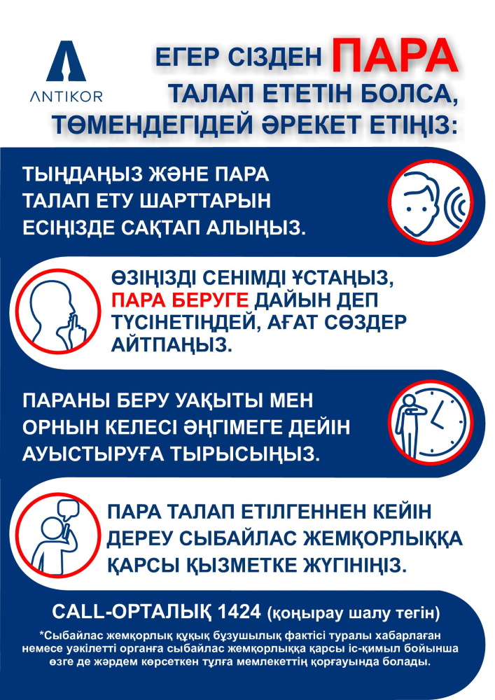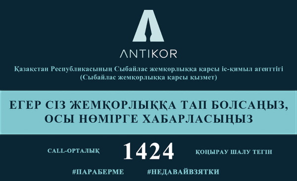 Егер сіз мемлекеттік қызметтерді алу кезінде сыбайлас жемқорлыққа тап болсаңыз, онда сіз Қазақстан Республикасы Сыбайлас жемқорлыққа қарсы іс-қимыл агенттігінің ANTIKOR 1424 CAII-орталығының бірыңғай нөмірі бойынша хабарласуыңыз қажет.